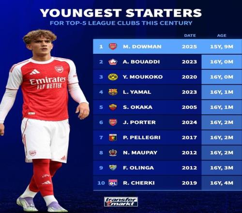 1、道曼(2025年阿森纳、15岁9个月)